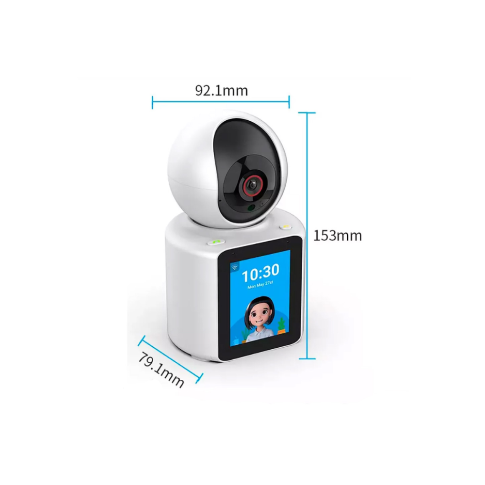Cámara IP robótica con funci” de videollamada, ideal para monitoreo de seguridad y comunicación en tiempo real. Con un diseño de pantalla IPS de 2.8 pulgadas, permite visualizar la fecha y hora, ofreciendo una experiencia de videollamada bidireccional clara. Equipado con un micrófono dual para una reducción de ruido profesional, la cámara asegura una comunicación inmersiva con voces claras y realistas. La cámara admite conexión WiFi de 2.4 GHz y ofrece un ángulo gran angular de 120 grados con resolución 1080P para imágenes nítidas y suaves. Incluye visión nocturna infrarroja y soporte para visualización remota a través de la aplicación móvil V360 PRO. Además, dispone de un despertador de voz con un alcance de 32.8 ft, facilitando el inicio de llamadas por parte de ancianos y niños. La cámara también cuenta con seguimiento móvil inteligente AI, que rastrea automáticamente objetos en movimiento y envía alertas en tiempo real a tu teléfono.
